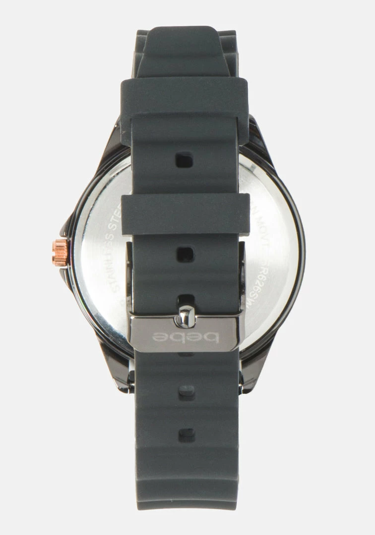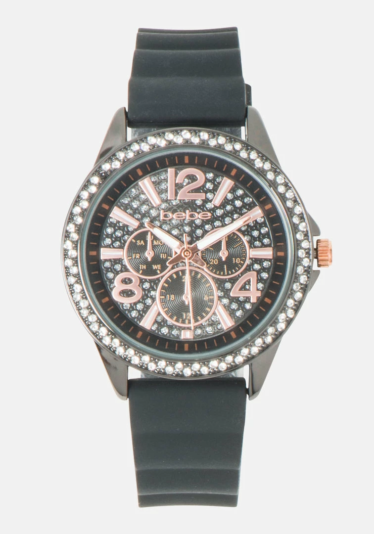 Fashion, function, and value, black IP plated crystal case with a black silicone strap.