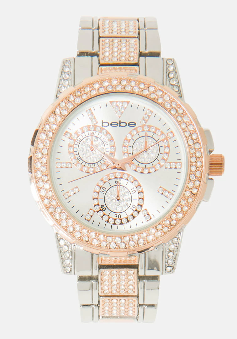 Fashion, function, and value, two-tone (gold & silver) crystal bracelet watch.