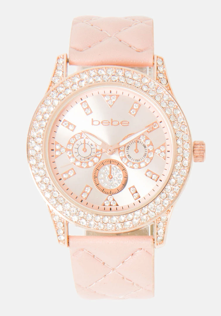 Fashion, function, and value. Crystal rose gold case with on-trend quilted Vegan Leather strap.