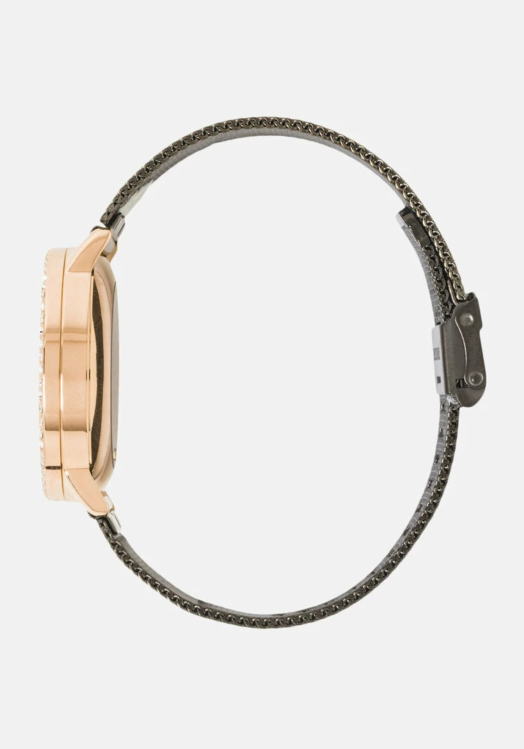 No need to choose between fashion and function with the bebe Smartwatch. Trend right wearable tech features a sleek mesh bracelet, magnetic closure, and crystal bezel plus all the functions to keep you connected and on the go. Easily compatible with both ISO and Android operating systems.