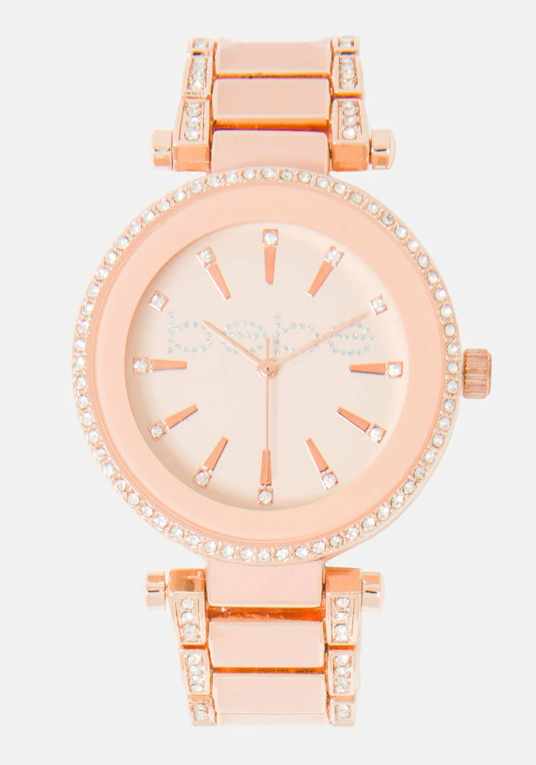 Fashion, function, value, blush and rose gold enamel case and bracelet with Iconic crystal BEBE Logo Dial.