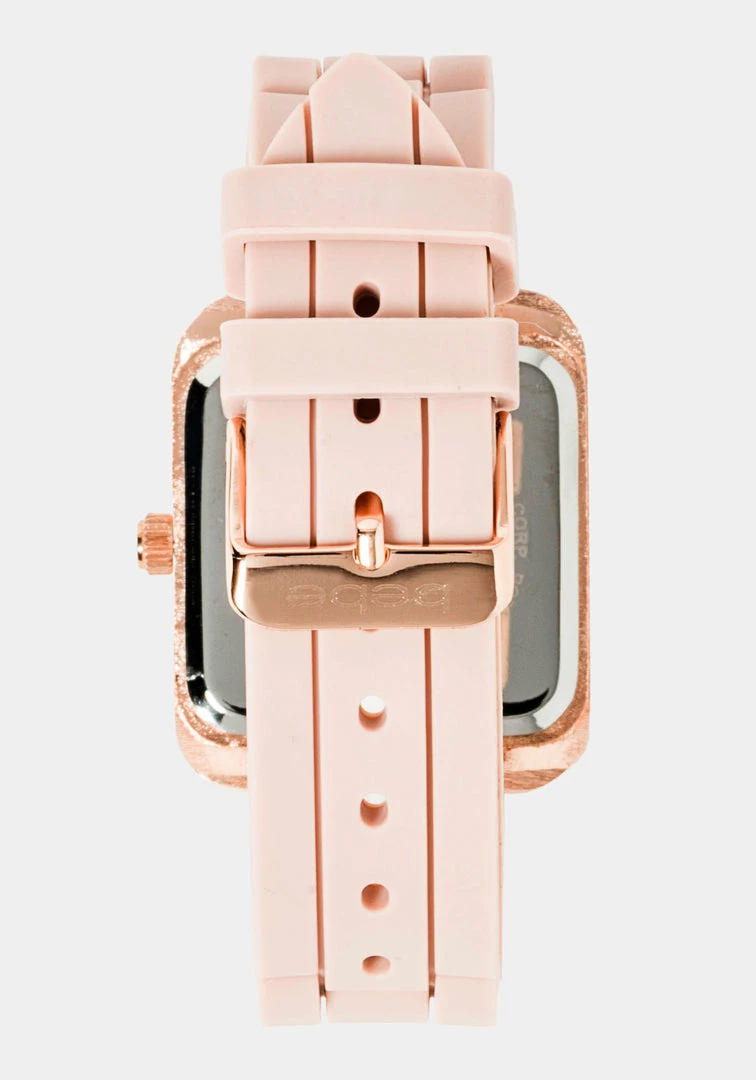 A flirty rose gold watch catches the eye with sparkling crystals on the numeral dial and square case.
