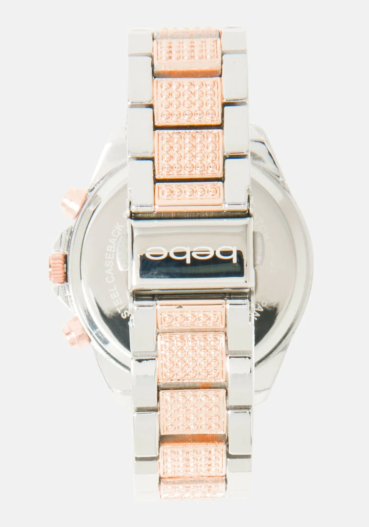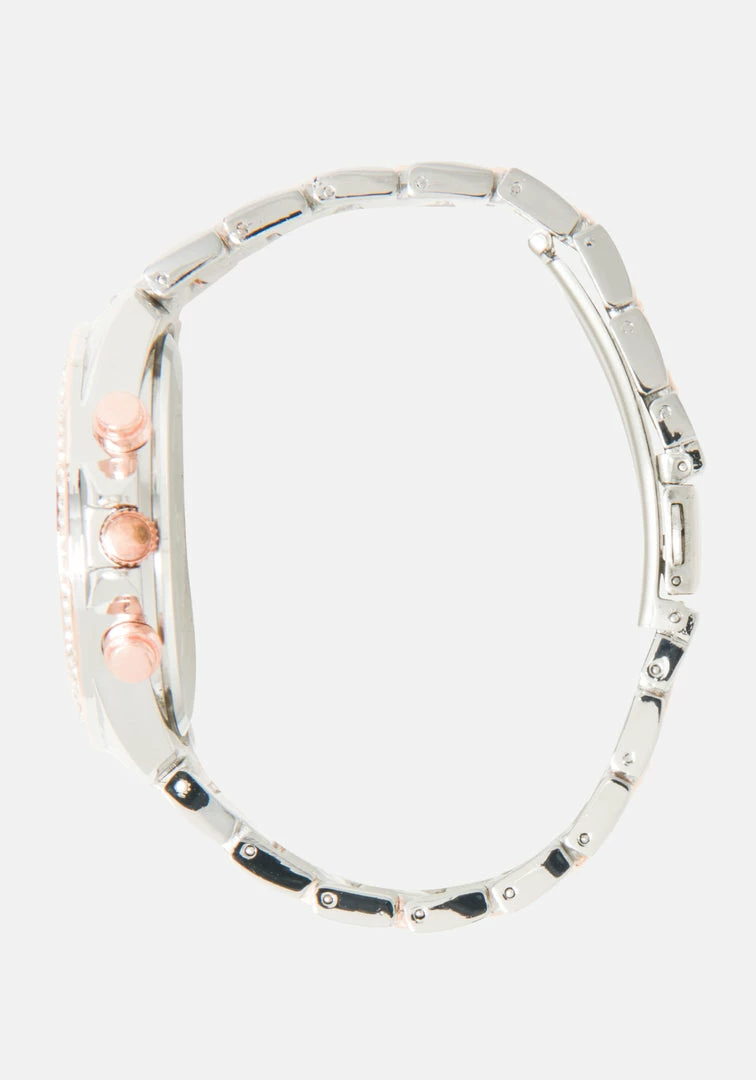 On-trend, two-tone (rosegold and silver) crystal watch with full pave crystal dial.