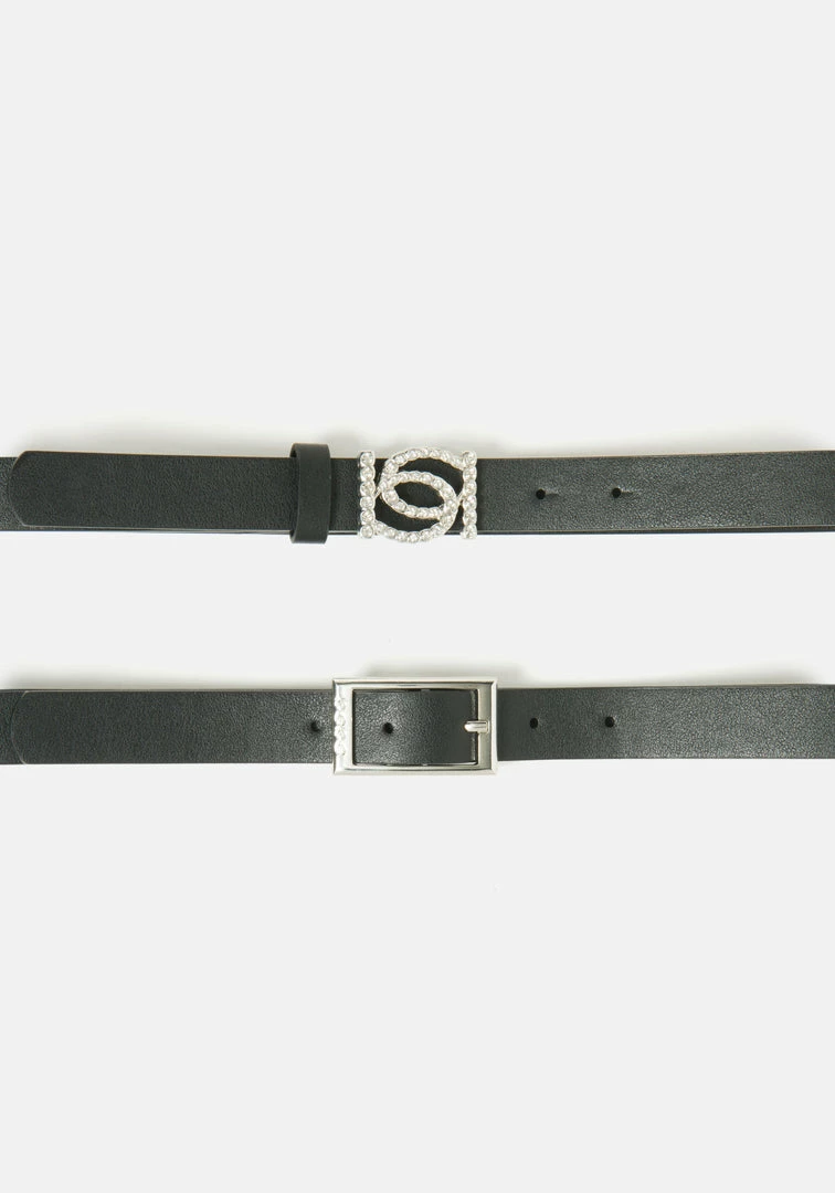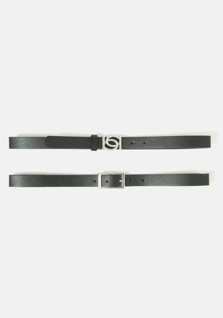 A girl’s gotta have options. Polish off any look with these slim black belts. One with Bebe Logo in Rhinestones buckle and a silver-tone buckle