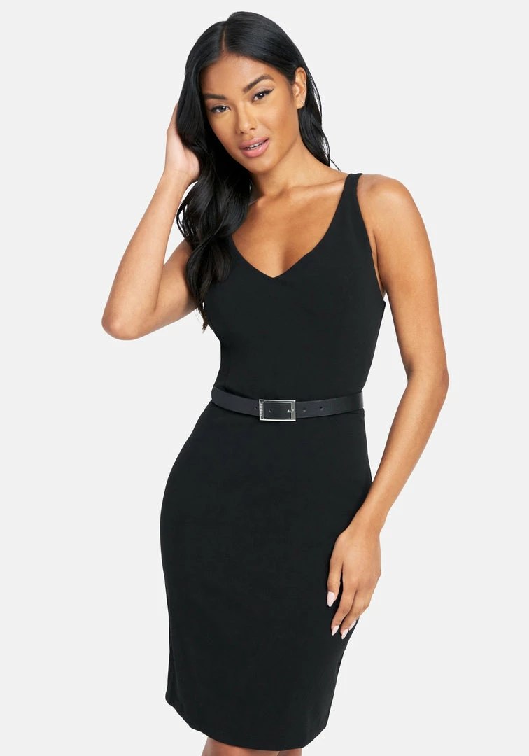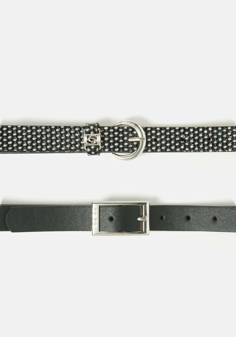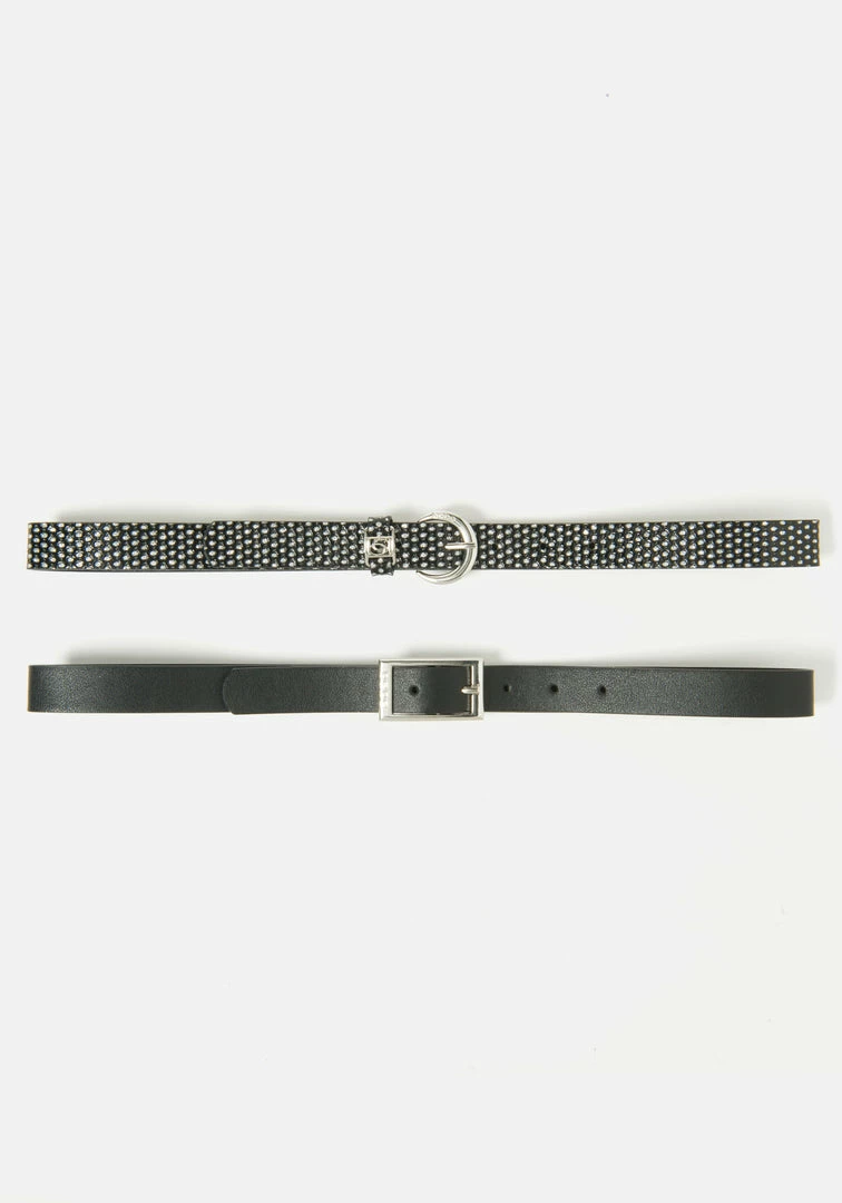 A girl’s gotta have options. Polish off any look with these slim belts. One with black and silver crystal with a silver-tone buckle and the other smooth black with a silver-tone buckle.