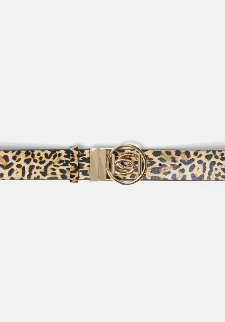 Double your chic by pairing your looks with this reversible belt! One side features a leopard print and the other solid black with a gold-tone buckle.