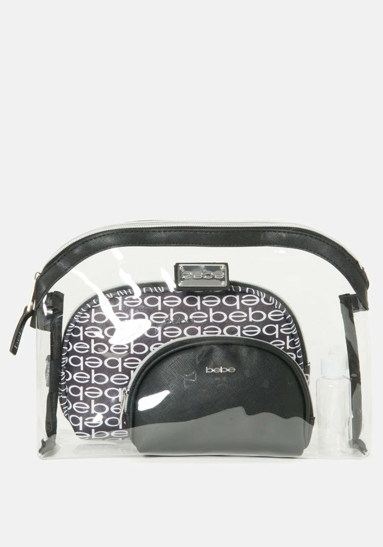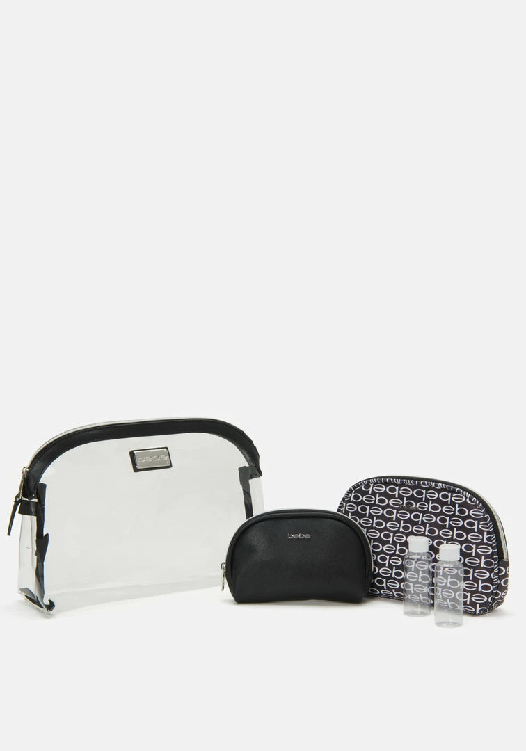 Hold your beauty essentials in these roomy Bebe Cosmetic Bags. Set includes 3 different size bags and 2 travel bottles that hold 50ml each. Perfect for your next trip.