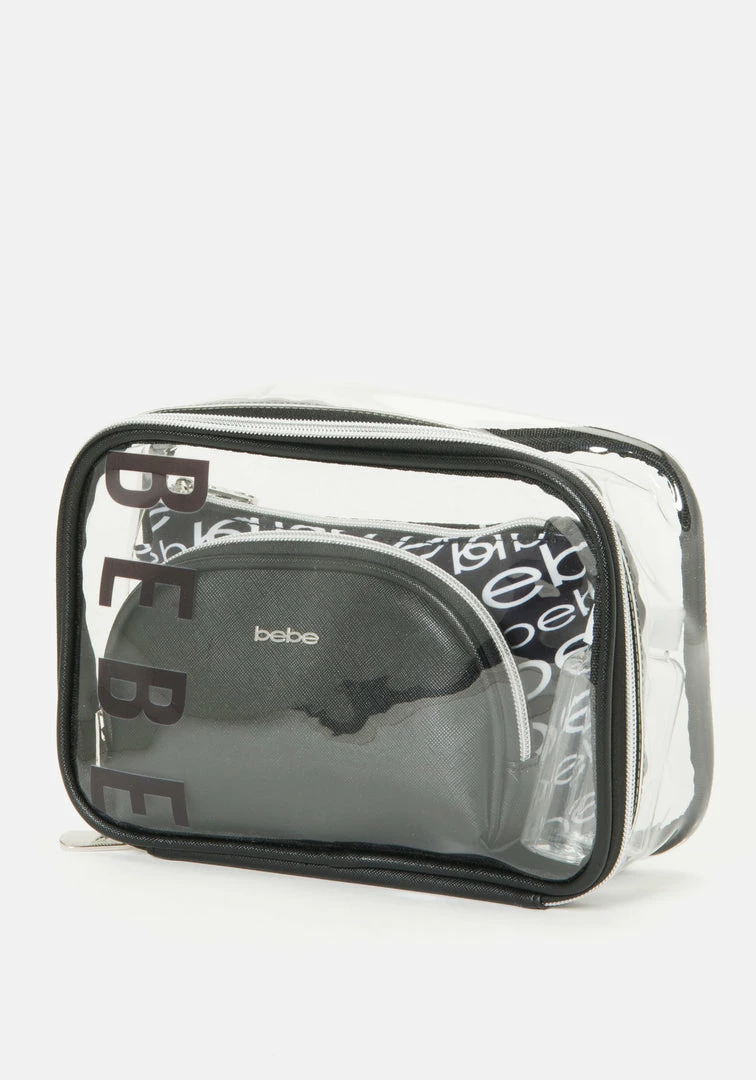 Hold your beauty essentials in these roomy Bebe Cosmetic Bags. Set includes 3 different size bags and 2 travel bottles that hold 50ml each. Perfect for your next trip.