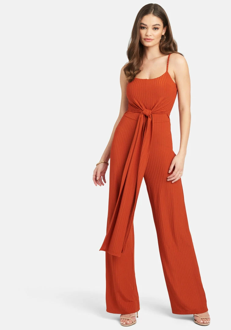 Like a vacay for your closet. Our Slinky Ribbed Knit Jumpsuit features a sexy knotted design at the waist, adjustable cami straps, and a wide cut through the leg.
