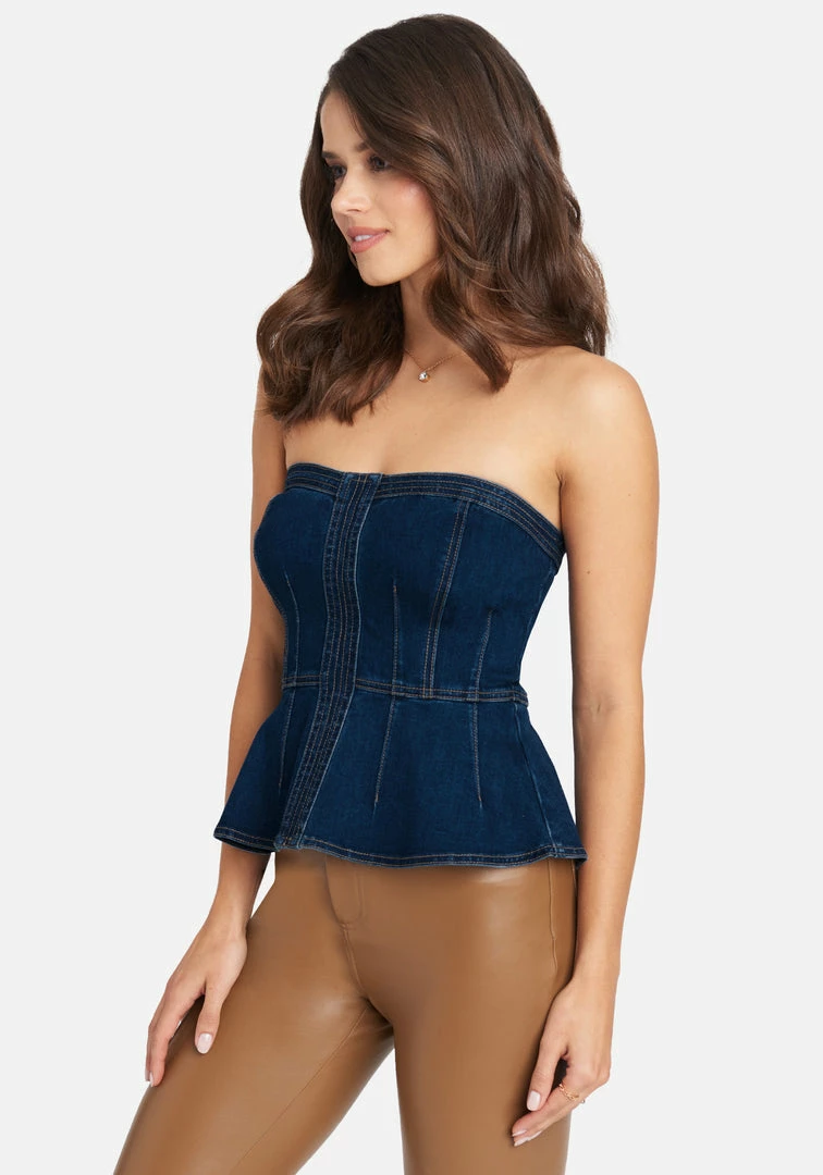 This Denim Bustier with multi-stitching and a peplum hem is ready for your next night out.