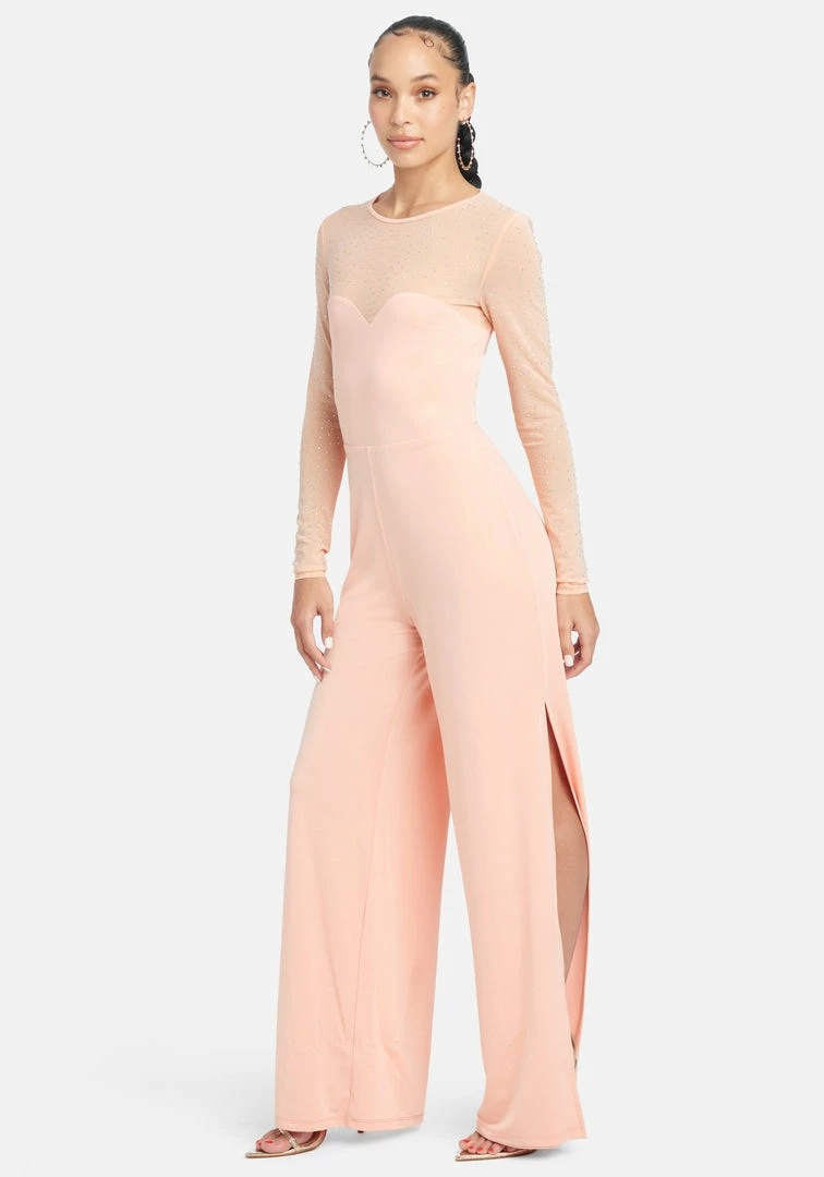 You will dazzle in the sexy Jumpsuit. Embellished illusion mesh and slinky jersey slit leg jumpsuit. Bodice and sleeve are unlined and embellished with crystals. Sweetheart neckline and an invisible center-back zipper.