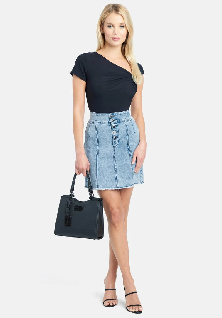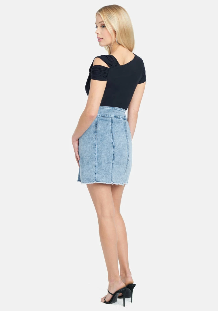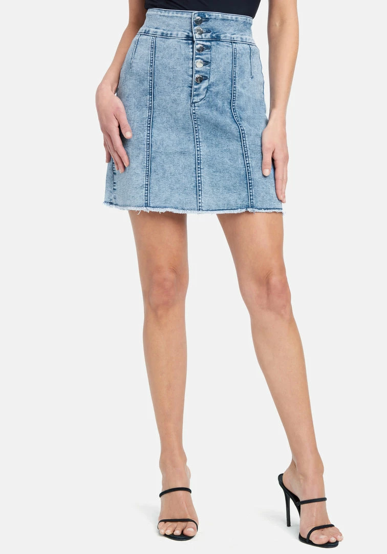 The Bebe Exposed Button Stitch Detail Denim Skirt is a must-have style for your wardrobe. Dress it down in sneakers or wear it out in heels and a crop top.