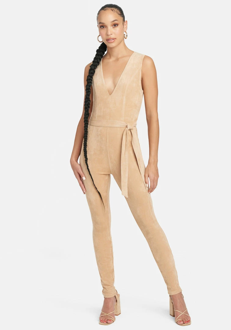 This is the one piece that does it all. Soft luxe faux suede jumpsuit features a sexy and figure-hugging fit from head to toe. Plunging neckline, front and back princess seams, self waist sash, and an invisible center back zipper.