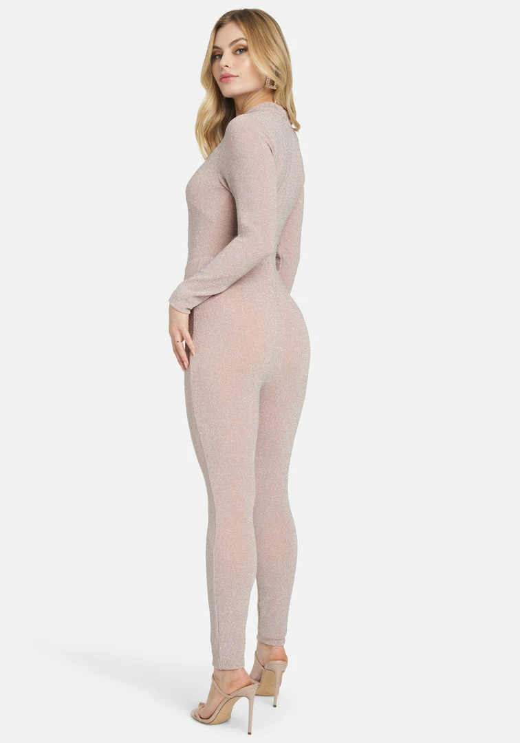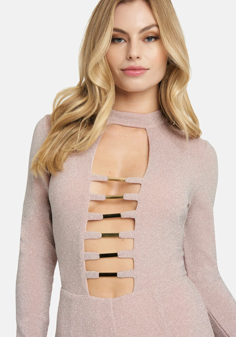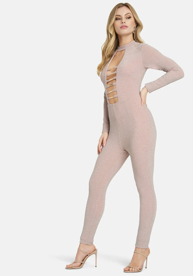 This long sleeve Bar Detail Jumpsuit features a curve-accentuating stretch that’s destined for a night out on the town.