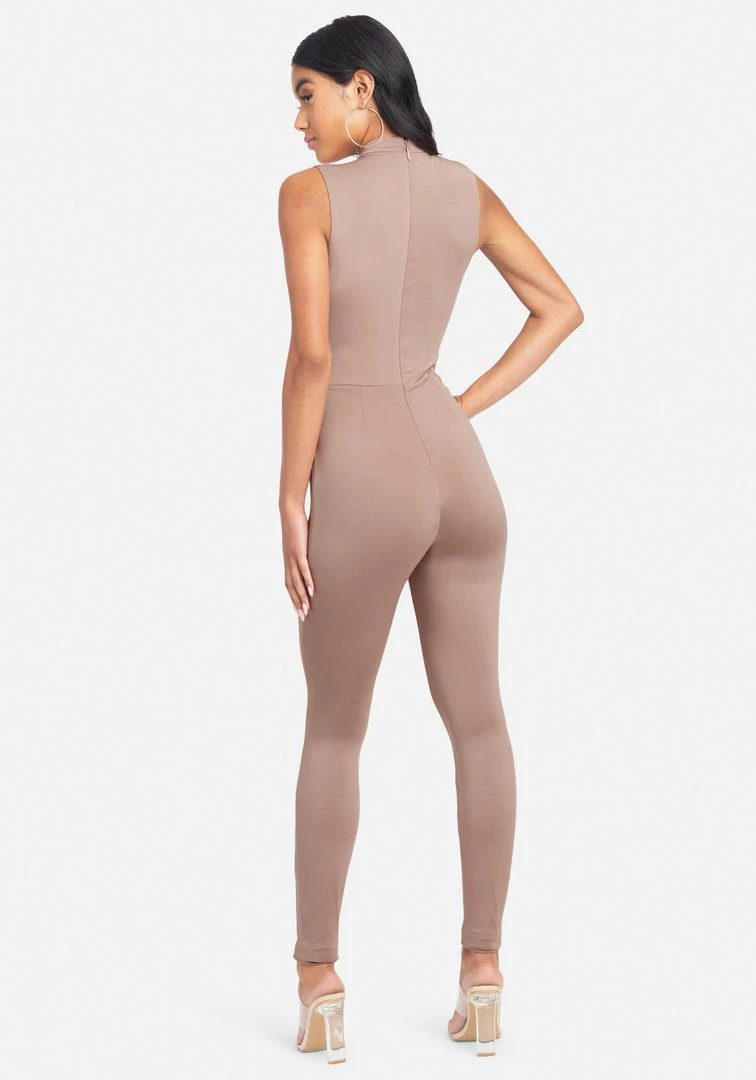 Take a walk on the sexy side in the Bebe Gold Bar Detail Jumpsuit designed in a figure-flattering style with a plunging neckline, hidden zipper closure on the back.