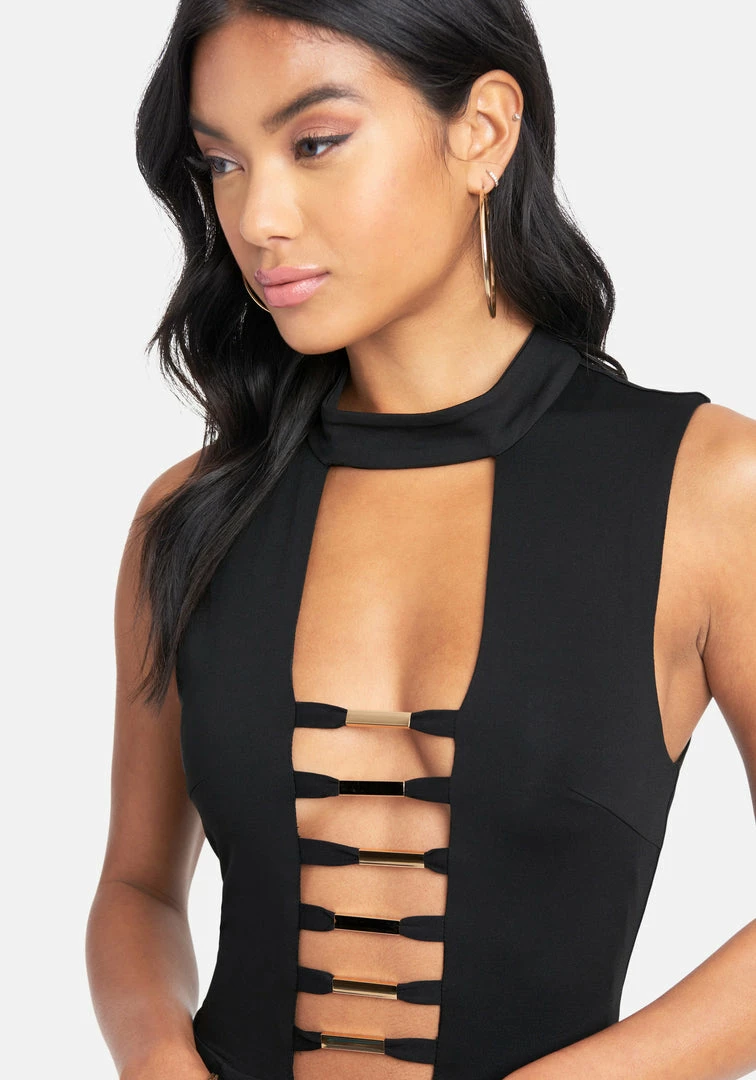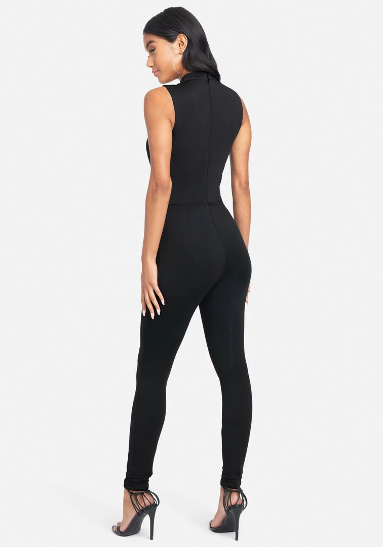 Take a walk on the daring side in the Bebe Gold Bar Detail Jumpsuit designed in a figure-flattering style with a plunging neckline, hidden zipper closure on the back.