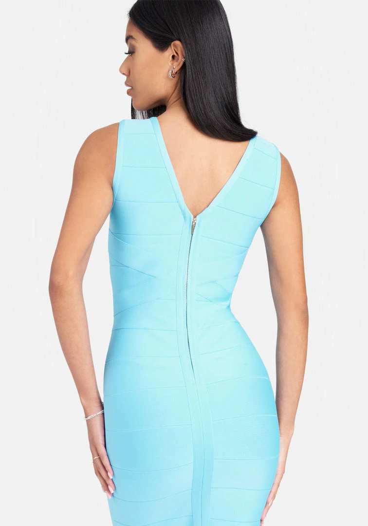 Our best-selling classic Bebe bandage midi dress. Featuring a double v- neck, exposed center back zipper with hook and eye closure. This sleek midi dress comes in a stretchy bandage design that makes every curve look perfect.