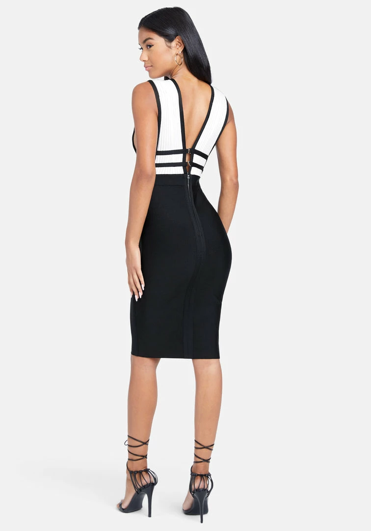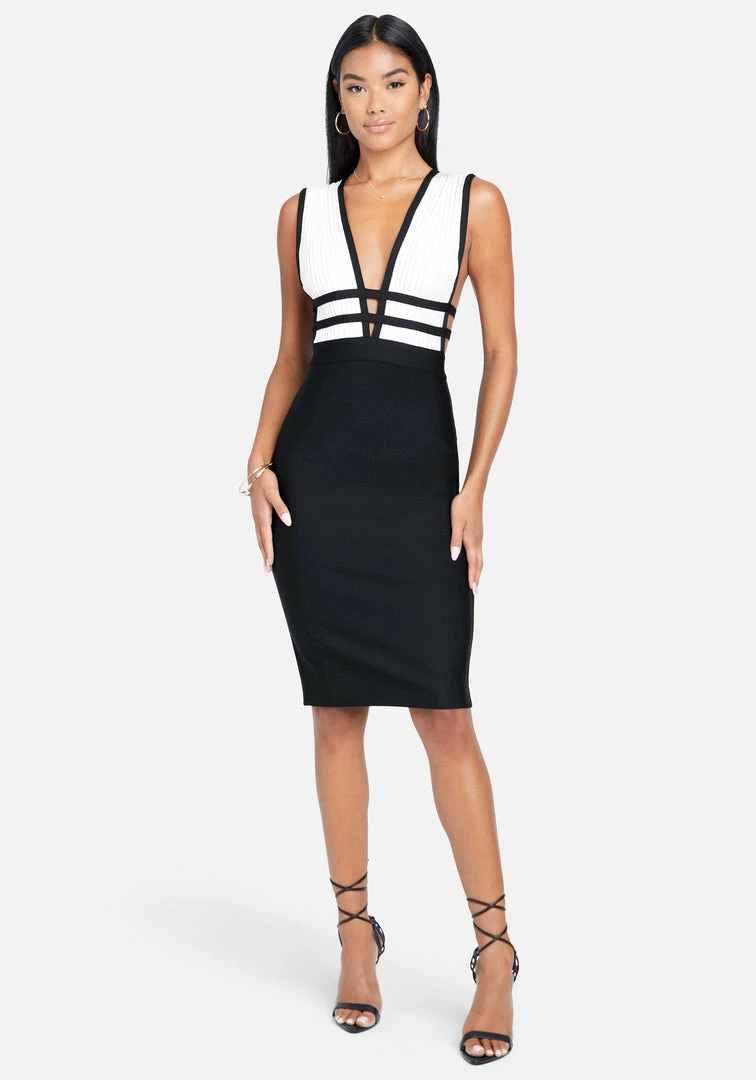 Top to bottom sexy. This sleek midi dress comes in a stretchy bandage design that makes every curve look perfect. Has deep front and back V-necks.