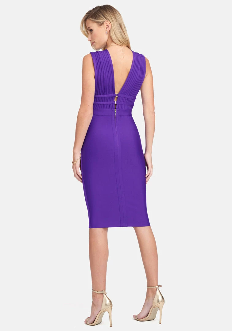 Top to bottom sexy. This sleek midi dress comes in a stretchy bandage design that makes every curve look perfect. Has deep front and back V-necks.