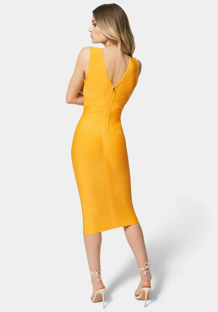 Our best-selling classic Bebe bandage midi dress. Featuring a double v- neck, exposed center back zipper with hook and eye closure. This sleek midi dress comes in a stretchy bandage design that makes every curve look perfect.