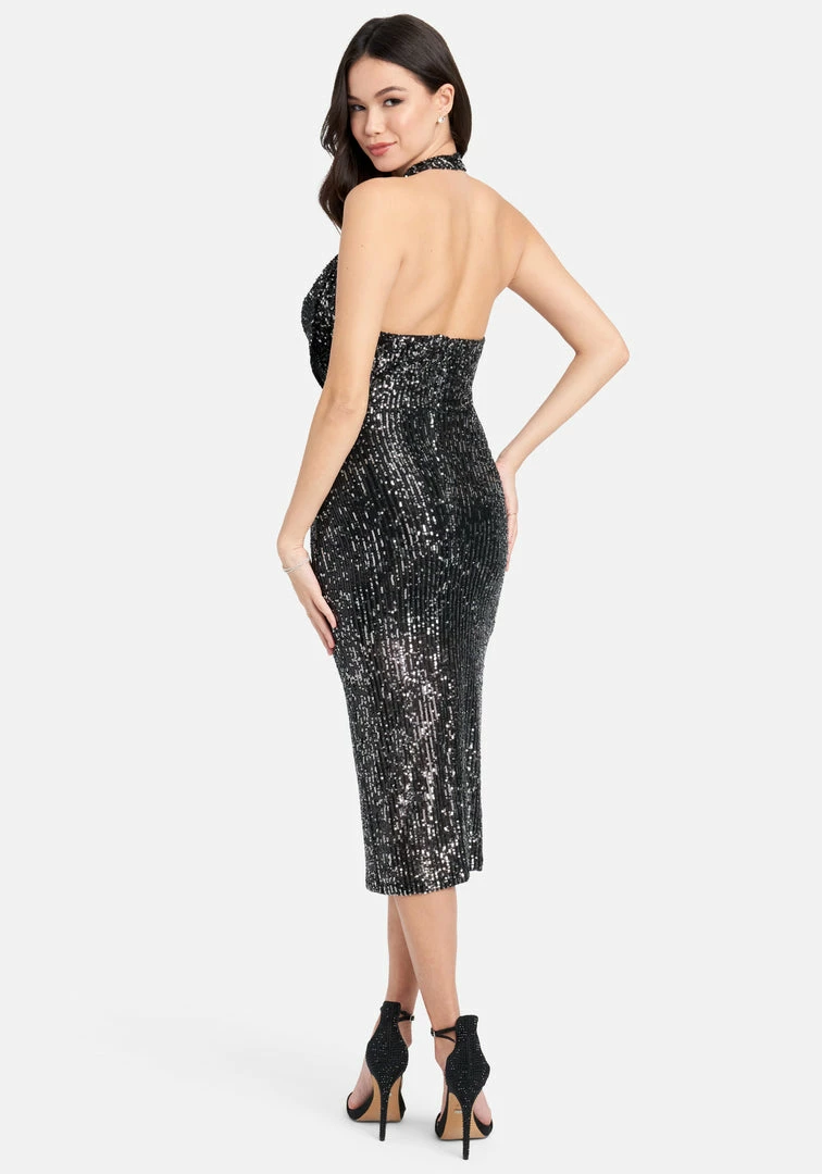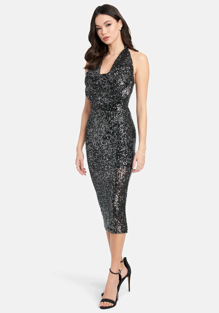 A sultry style that will be a hit at any party. This Sequin Cowl Dress features a halter top and a midi fit.