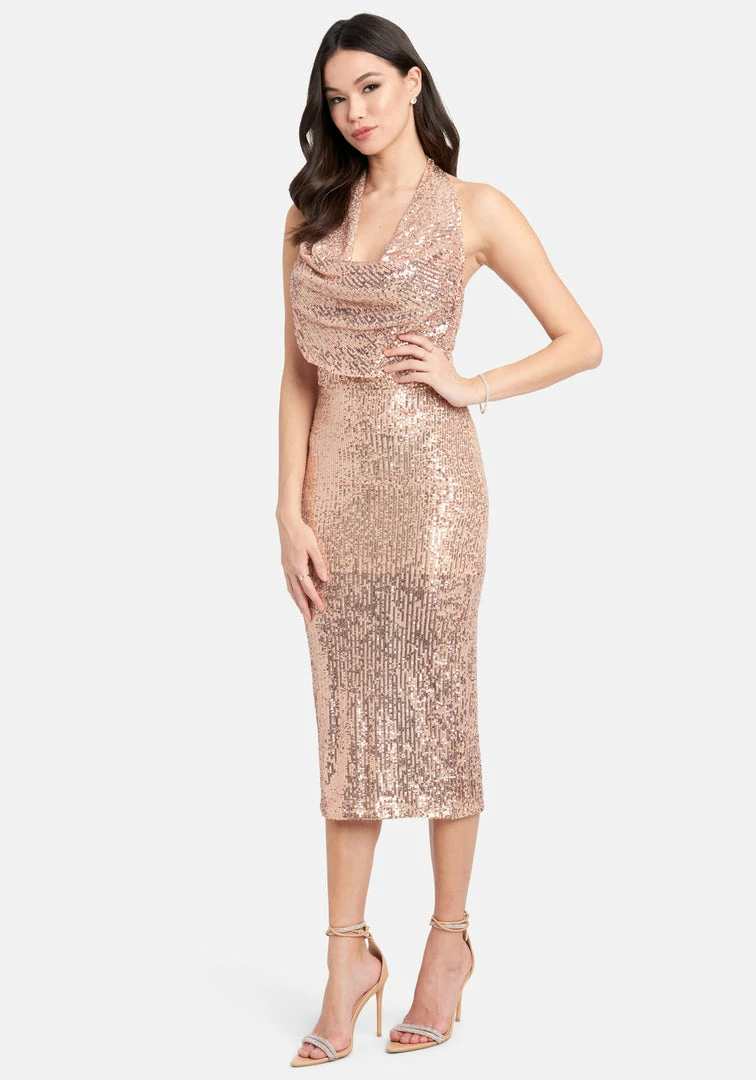 A sultry style that will be a hit at any party. This Sequin Cowl Dress features a halter top and a midi fit.