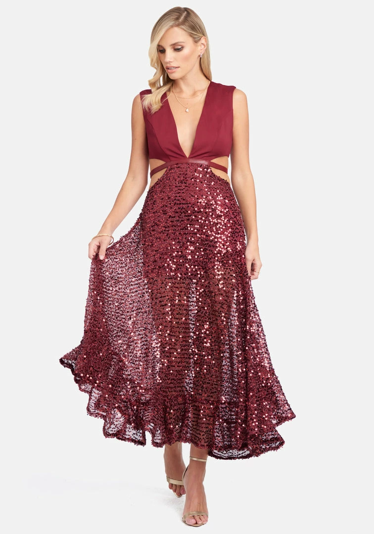 Showcase your glam side in this effortlessly daring Sequin Mesh Gown designed with just the right amount of shine and look-at-me cutouts.