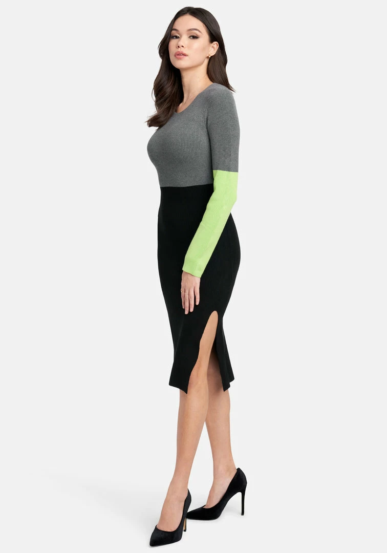 This dress is a must-have! Sexy, sleek, and two-toned. Featuring long sleeves and rib-knit.