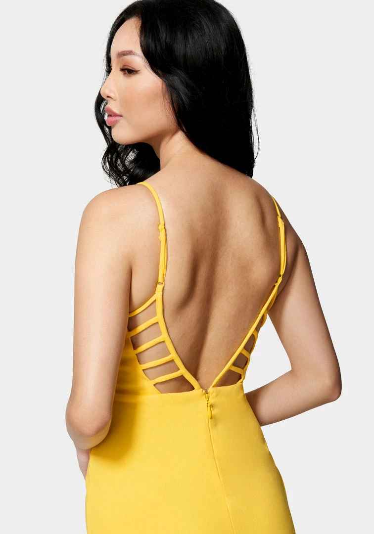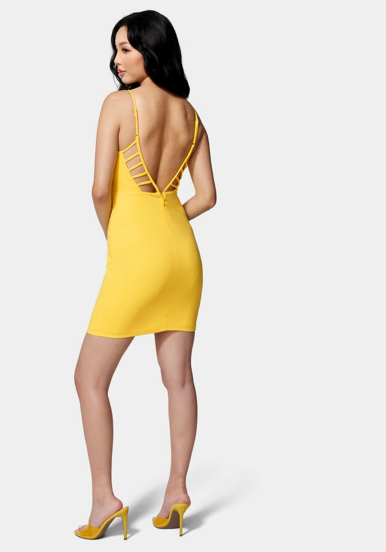Turn heads in this soft knit mini dress, designed with a wrap overlay neckline, caged cutout back, adjustable straps, and a bodycon silhouette that’s made to fit and flatter.