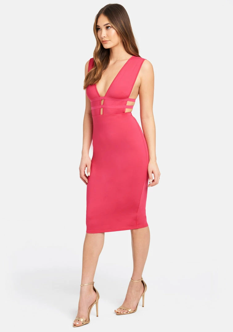 Love is in the air! This is a slinky knit dress with a caged cutout design, plunge neckline and back and a bodycon silhouette. Features a hidden back zipper for that perfect fit.
