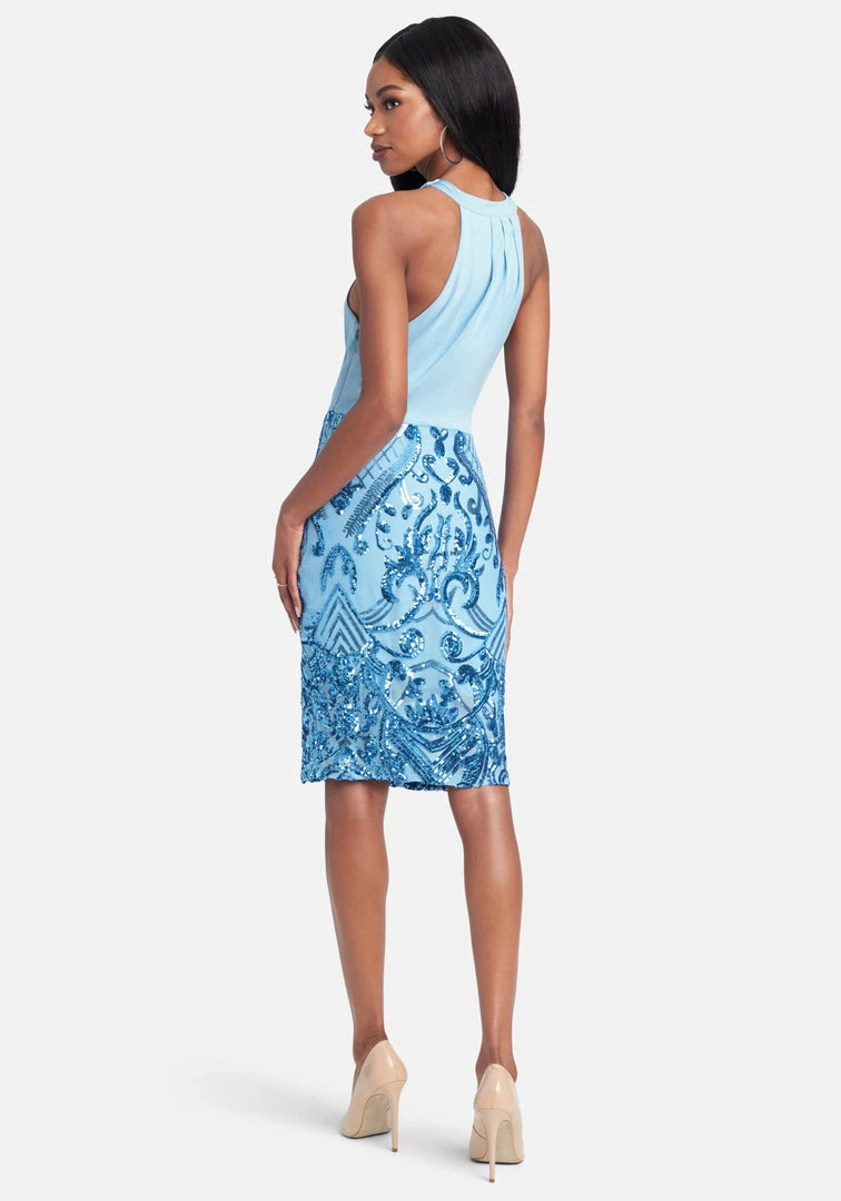 All eyes on you in this eye-catching flirty style. This Drapey Sequin Dress features a figure-flattering fit and intricate sequin designs on a skirt that hits right below the knee.