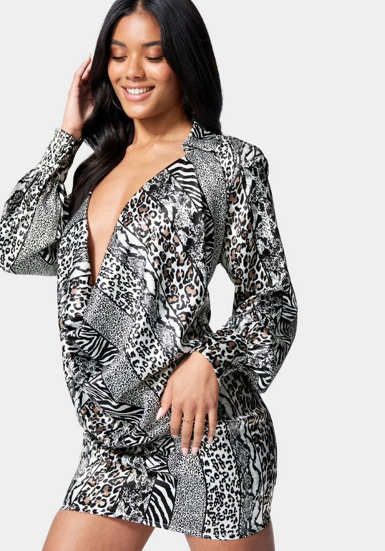 Elevate your cocktail hour in a dress that does it all. Made in printed satin, this shirt dress features a waterfall cowl neckline, long sleeves, and an effortless silhouette that gives you some room while still accentuating your curves.