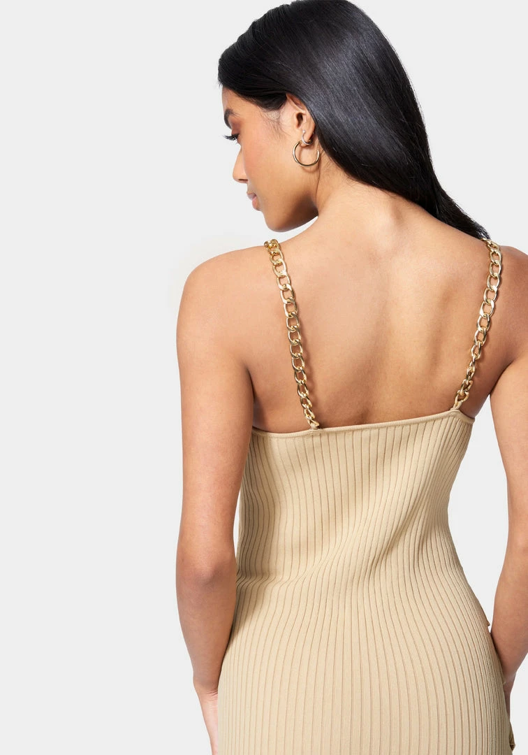 You look expensive. This ribbed knit mini dress features gold-tone chain shoulder straps, a faux wrap neckline, in a form fitting silhouette that flatters.
