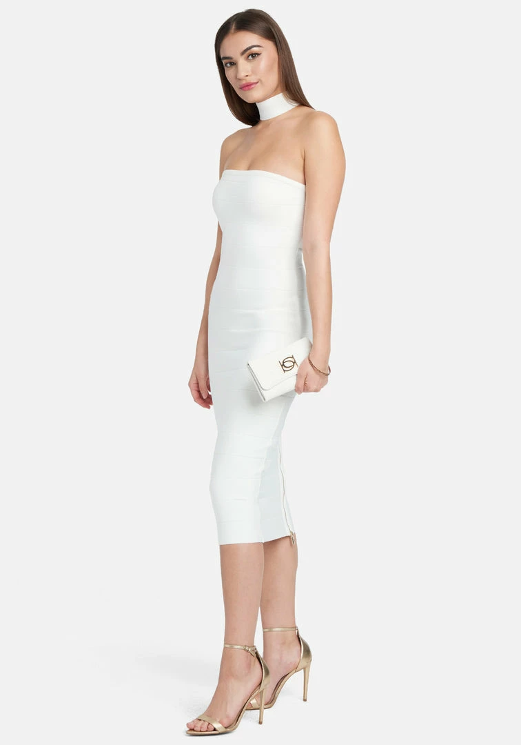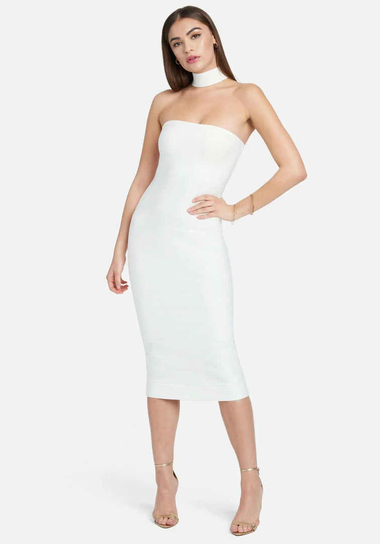 Showcase your sultry side in this Choker Neck Bandage Midi Dress that features a strapless shoulder-baring fit sure to inspire a few toasts in your name.