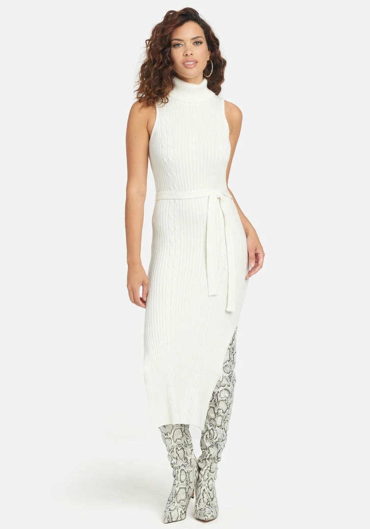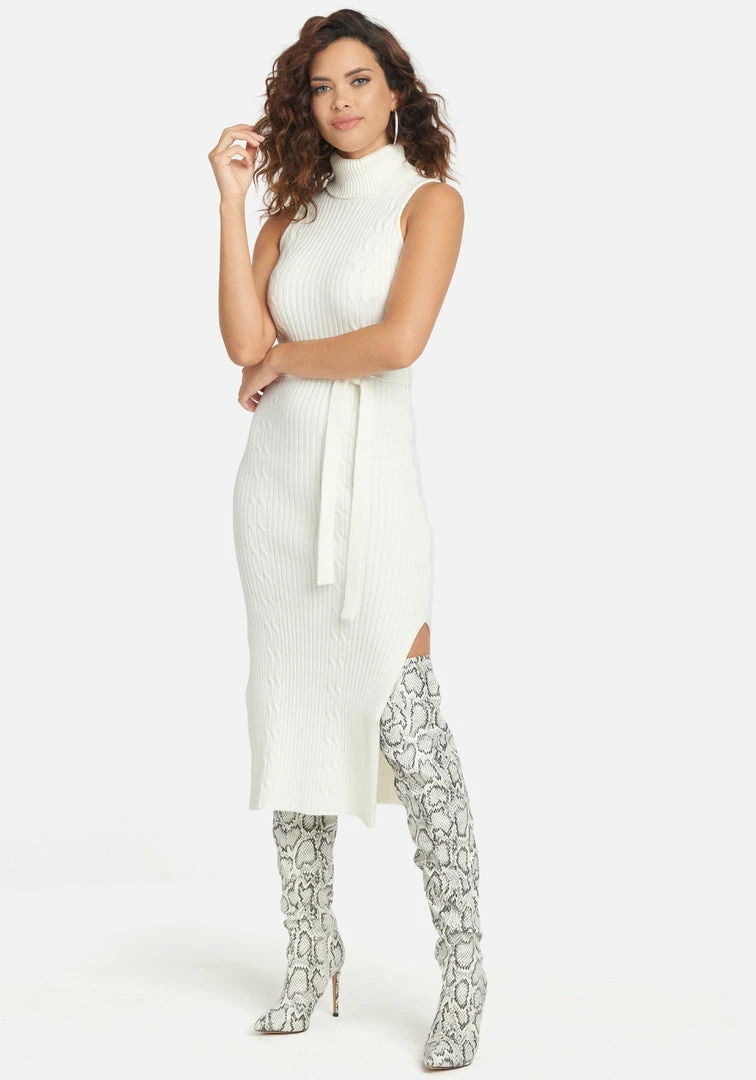 Pass the office dress code in this midi sweater dress detailed with classy cables and a mock neck. Slit makes it great for nighttime too. Includes detachable tie belt. No closures.
