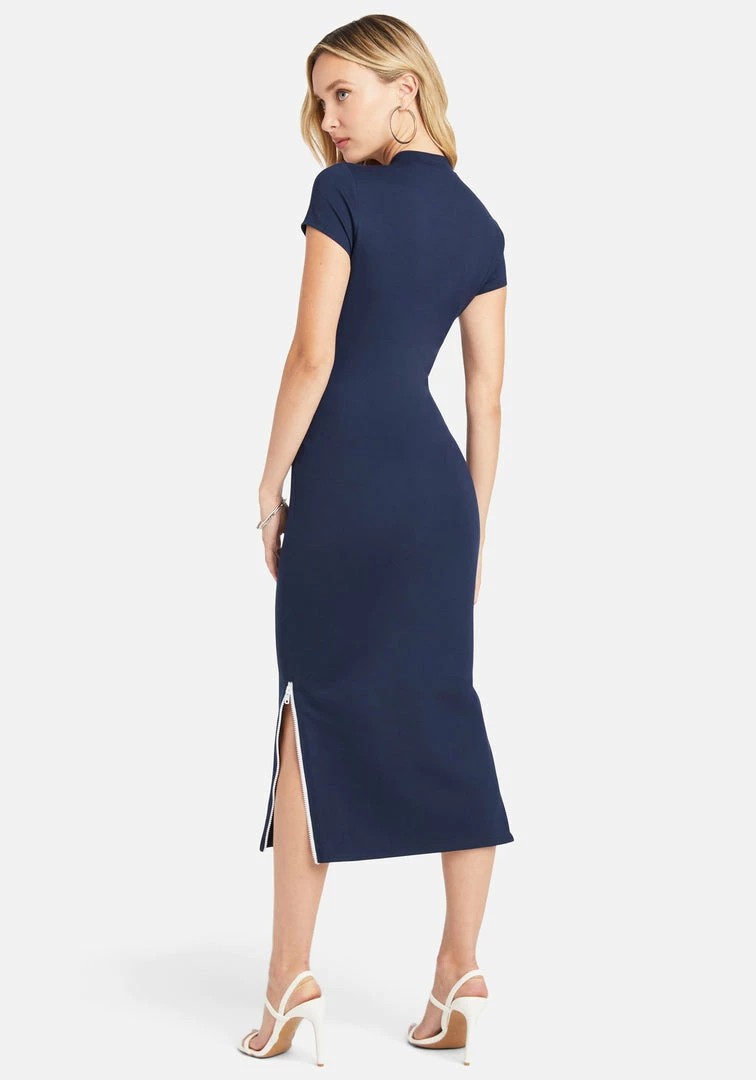 In this dress, you can give a little leg. The Bebe Contrast Detail Quarter Zip Dress is the perfect midi style to dress up or down. It features short sleeves, a bodycon fit, and side zippers on the hem.
