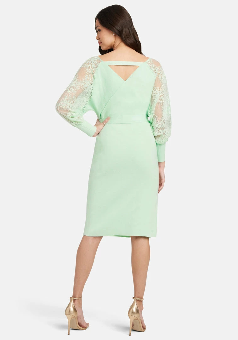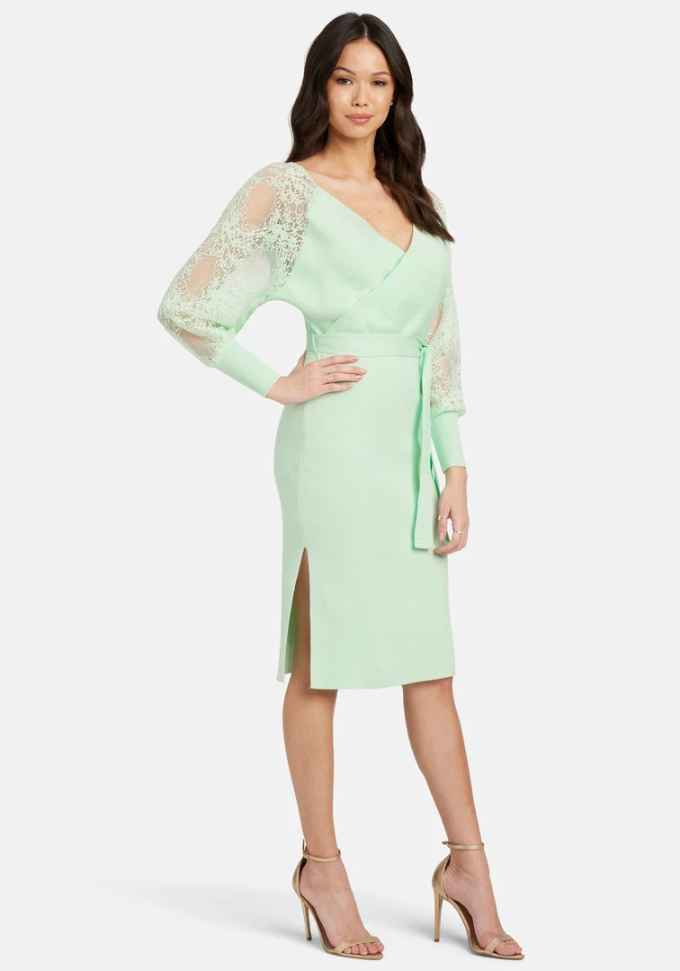 Sweeten up sweater weather dressing with this gorgeous Lace Detail Sweater Midi Dress. Features lace sleeves with a flattering wrap silhouette and beautifully draped bodice.
