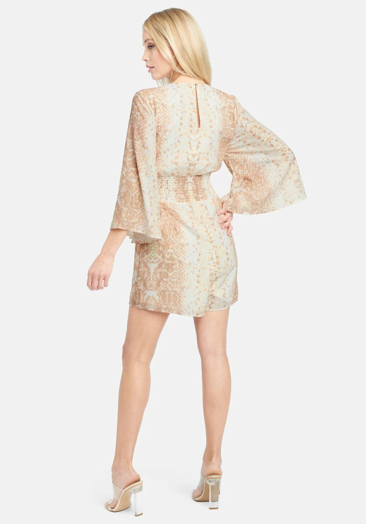 Bebe Lace Up Flutter Sleeve Romper designed to charm the room in an all-over snakeskin printed georgette. Features a lace-up tassel detail center front neckline and flowy sleeve with smocked empire waist. Center back invisible zipper with hook and eye closure.