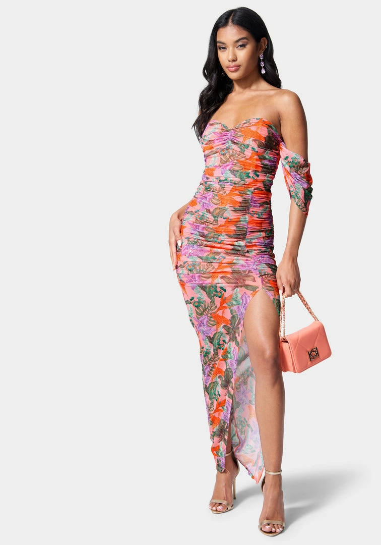 Things are about to heat up. Made in a floral printed mesh. this sultry gown features an off-the-shoulder silhouette with short sleeves, a high front slit, and ruching throughout that accentuates your every curve.