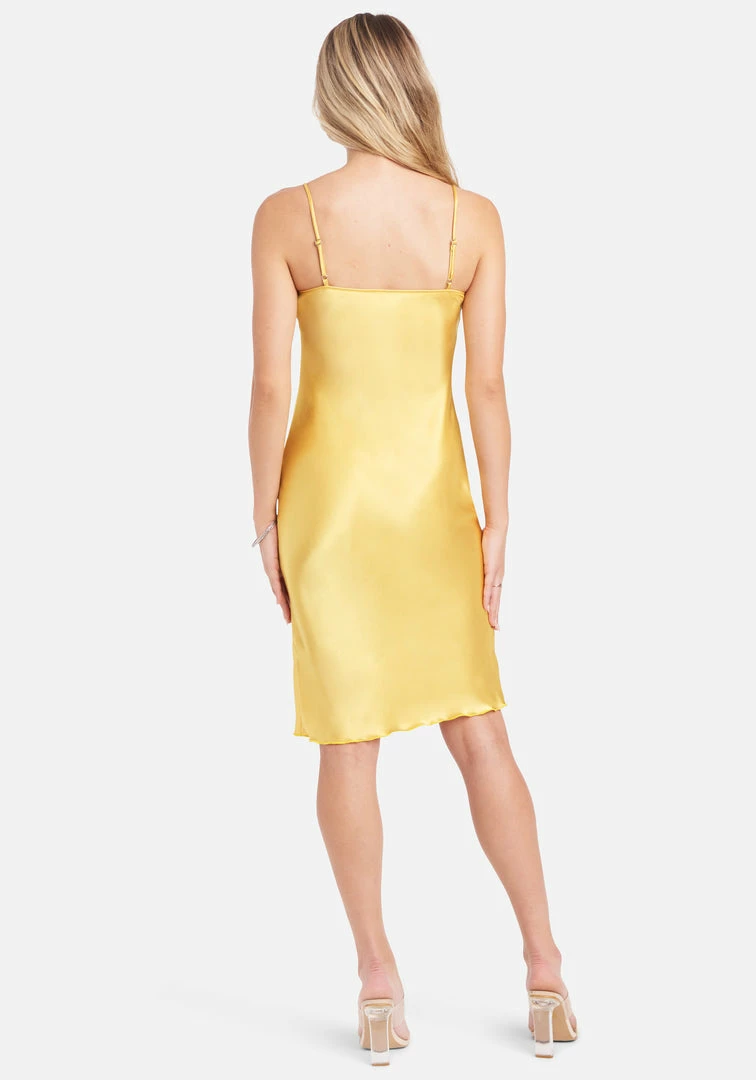 The iconic satin slip dress makes a comeback. This v-neck sleek and smooth satin slip dress is a wardrobe staple. Style with heels or flats for a more casual look.