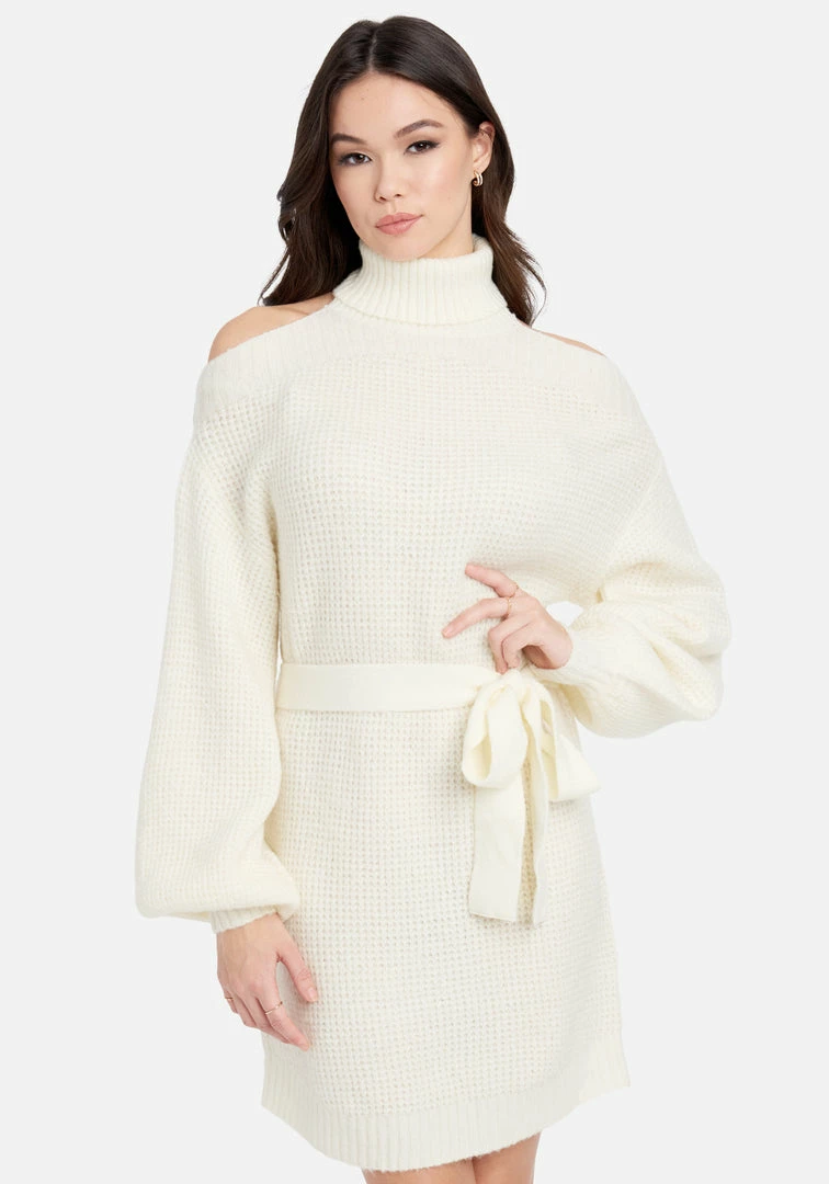 A beautifully textured knit designed with a matching tie accentuates the waist of this Cold Shoulder Halter Sweater Dress.