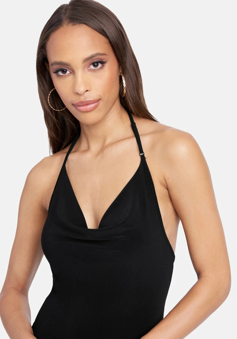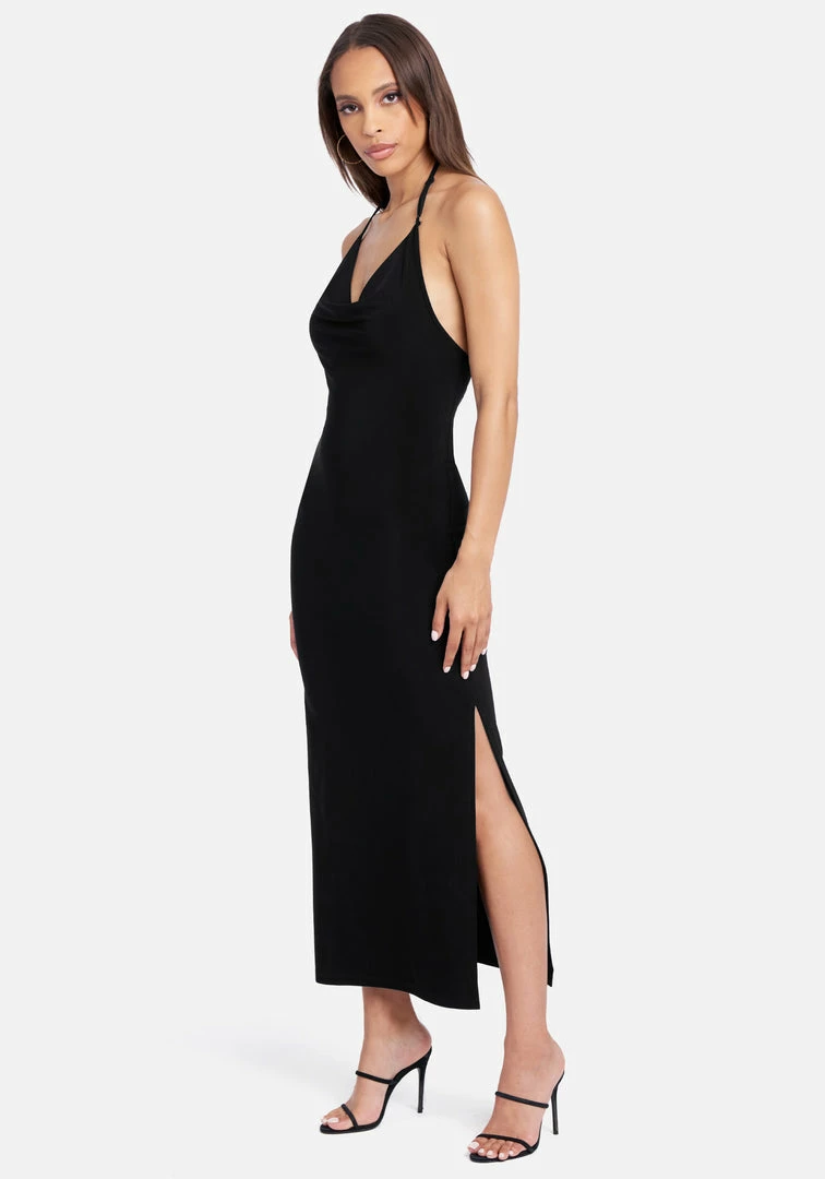 Sultry and sophisticated, get ready for an unbelievable night in the Bebe Cowl Neck Halter Maxi featuring a show of skin and a slinky silhouette.
