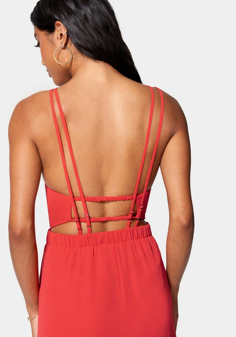 Summer’s a breeze. This faux wrap maxi dress features a sheer overlay with a mini skirt lining, a strappy caged back, and a flowy silhouette. Pair with a stiletto heel or lucite sandal for a hot night out.