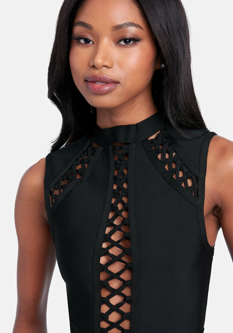 A sultry style that will get everyone’s attention. This Bandage Dress features an intricate lace up opening in the front and a hidden back zipper.