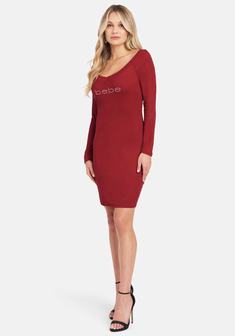 The perfect fit. This stretchy tank dress fits like a glove with V-neckline and features sparkly Bebe logo.