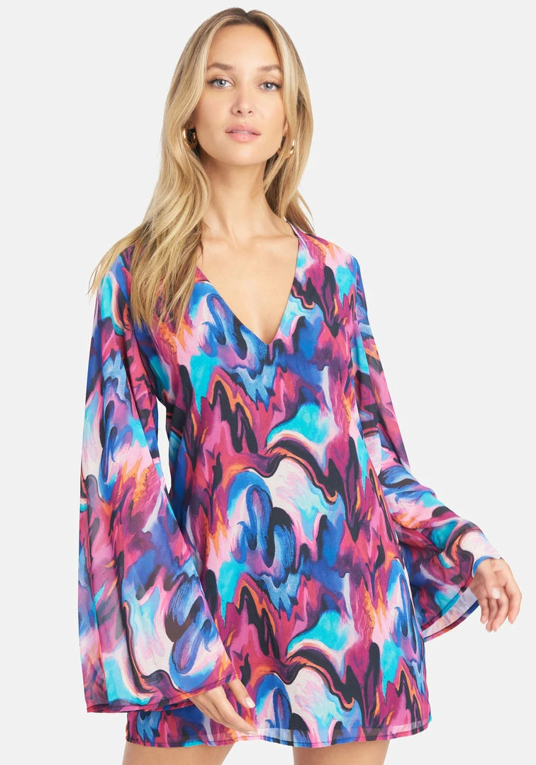 This mini is mesmerizing. Our Bebe Long Sleeve Printed Trapeze Dress features a vibrant all-over print and bell sleeves.