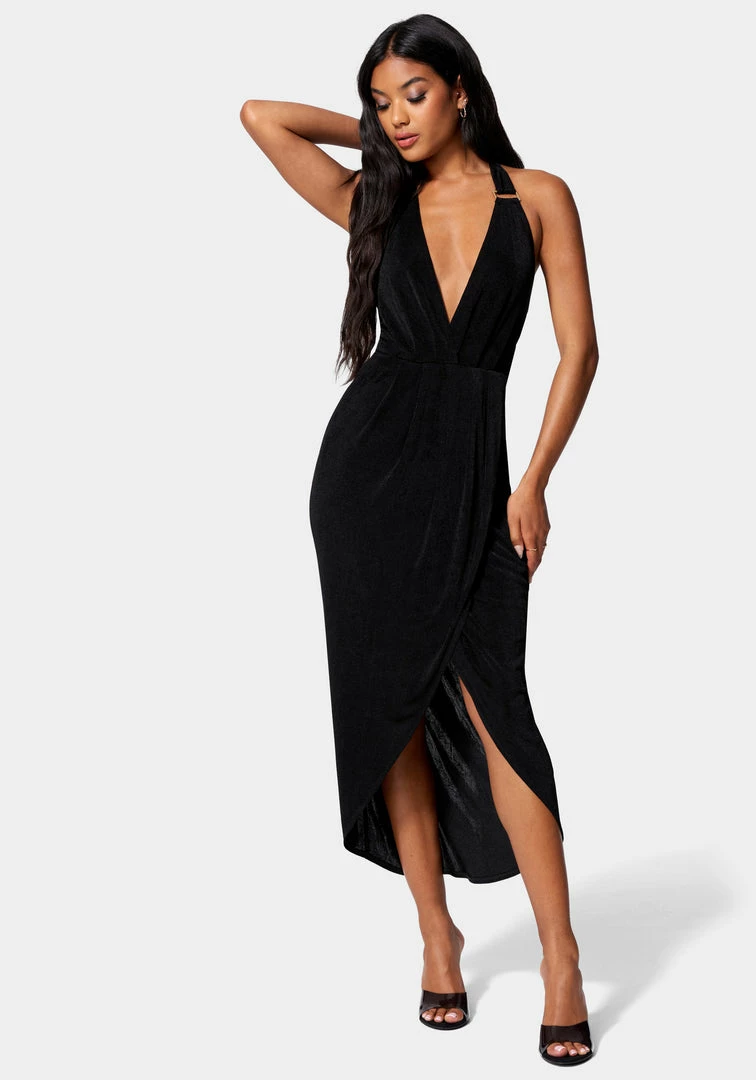 Slip into this Bebe Asymmetrical Halter Neck Slinky Dress for an unbelievable night featuring a sexy show of skin with a plunging neckline and high-low hem.