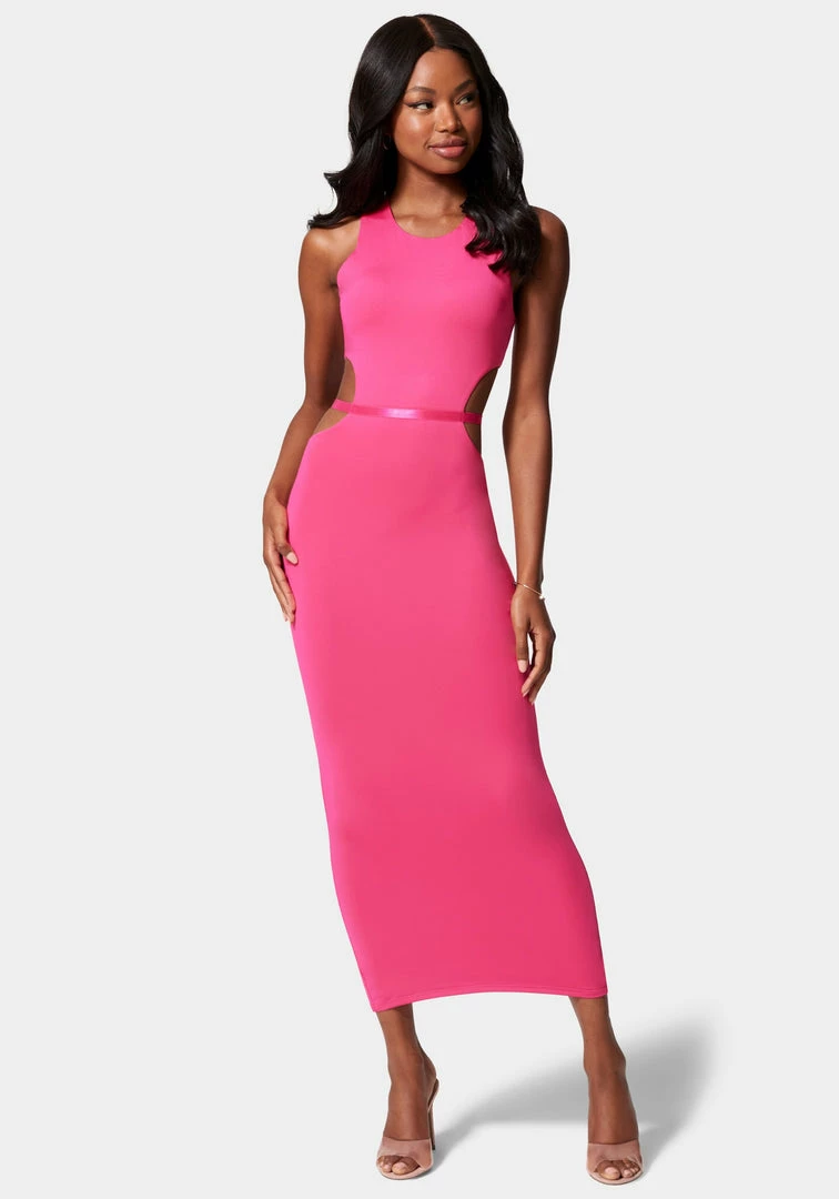 Sleek and edgy, this midi dress features waist cutouts with a belt closure, a sleeveless cut, an exposed back zipper, and a curve-hugging fit throughout.