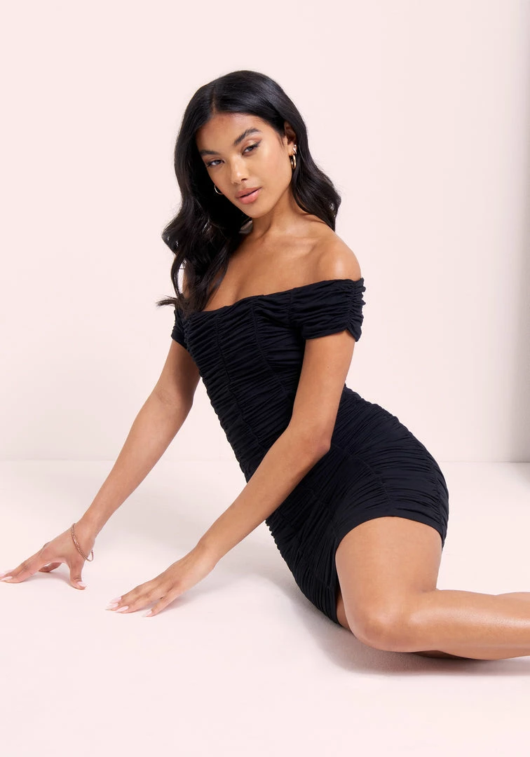 New dress, who’s this? This mini dress features a sexy off-shoulder neckline and ruching throughout. Pair with strappy heels and a statement coat for your next date.