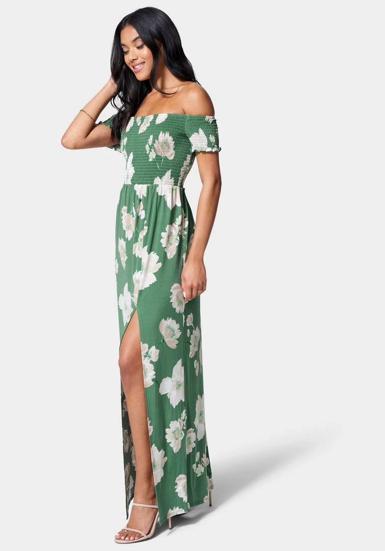 You’ll breeze through warmer weather in this off-shoulder maxi dress. Designed in a floral print, this flirty number features a smocked bust, short sleeves, and a front leg slit for some added drama.
